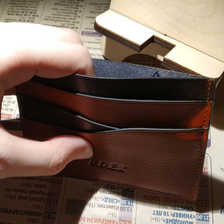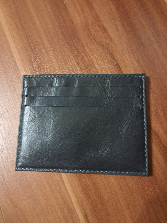 Темно-синий цвет ближе к чёрному, что порадовало, т.к. подходит к любой сумке. Запах легкий, пахнет натуральной кожей. Сшито ровно и аккуратно. Достаточно тонкая, чтобы просто положить в карман и выйти на перерыв или в магазин или положить в маленькую сумочку.