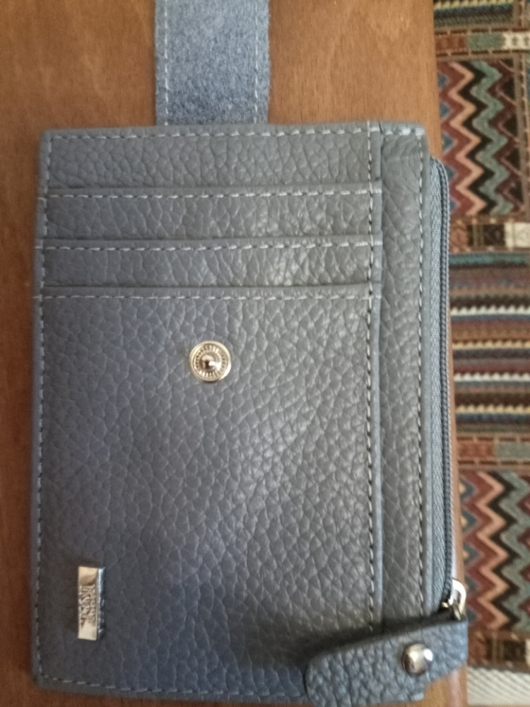 Удобная кредитница,. 4 кармана и отделение на молнии позволяю разместить несколько карт и мелочь., Сшито очень аккуратно. Приятный серо-голубо цвет.