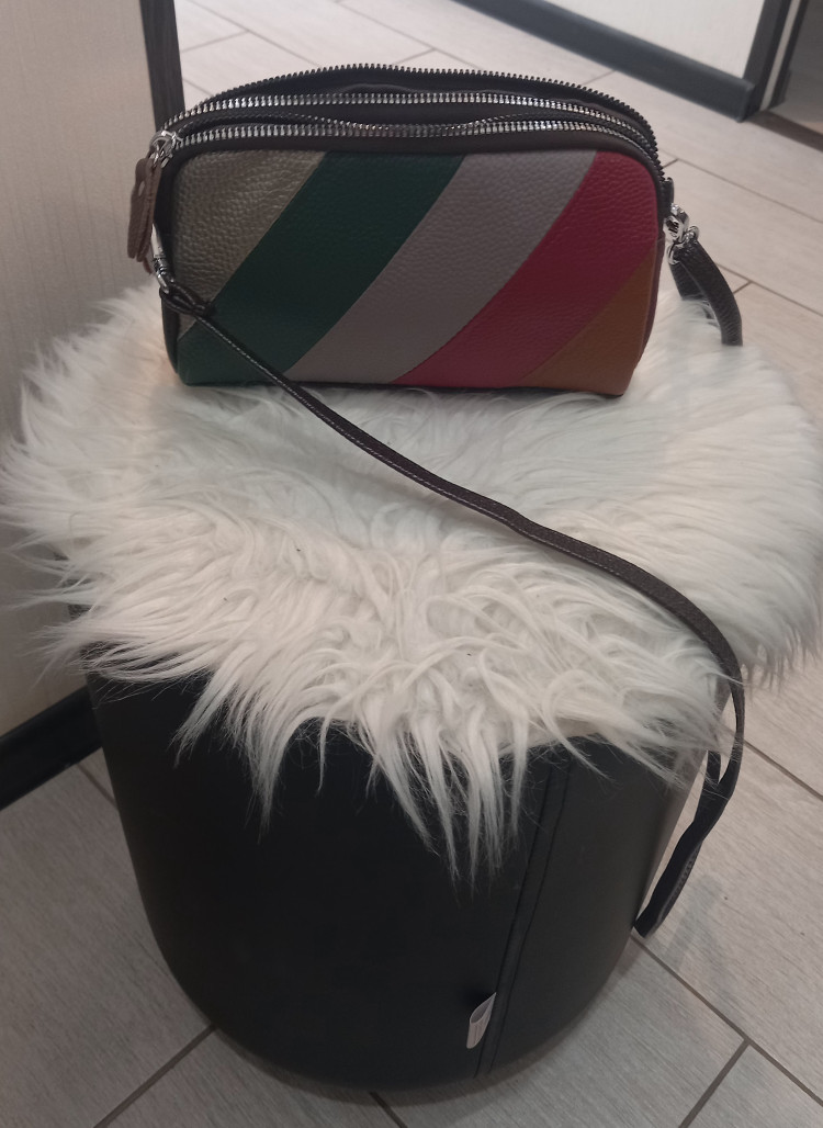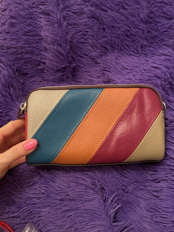 Сумочка очень яркая, разноцветная, кожаная. Подходит как под классический образ, так и под спортивный.Имеет два ремешка. Внутри два отделения, и два кармана. Достаточно вместительная. Очень довольна. Рекомендую. Спасибо, Baggins.