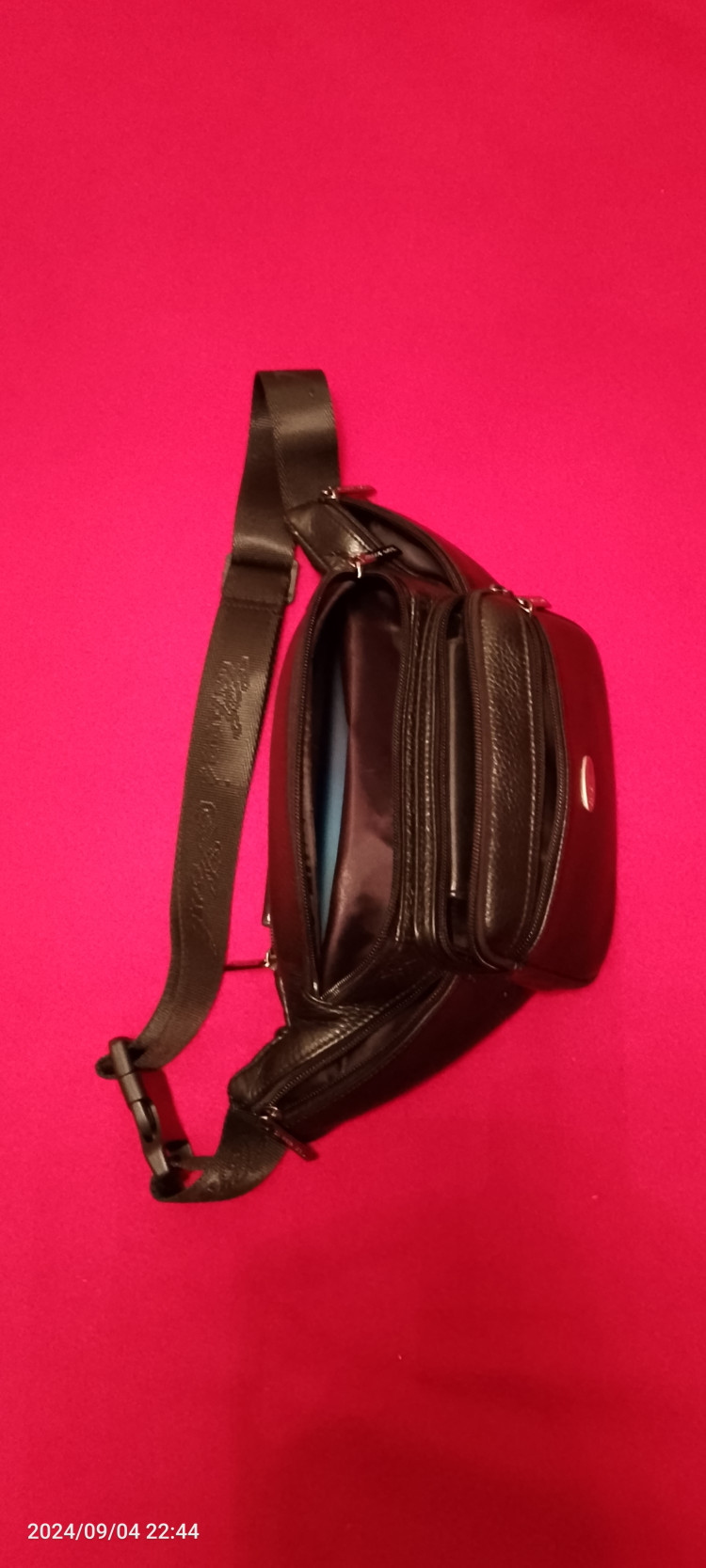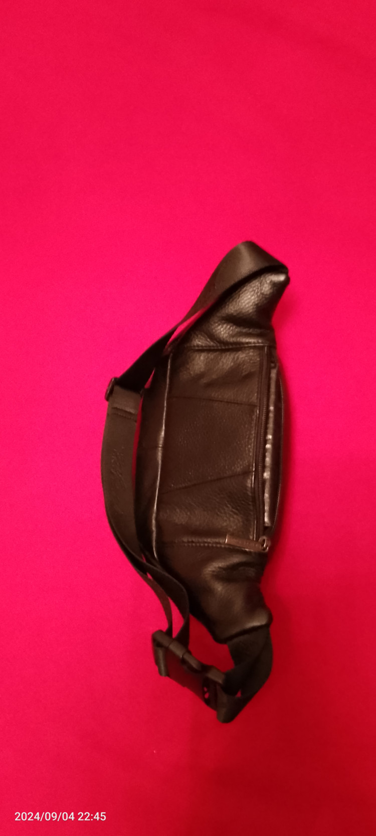 Стандартная сумка на пояс. Застёжка поясного ремня под правую руку. Два отделения на молнии ( в большом также два отделения), на маленьком также карман на молнии, один карман на внутренней стороне, и два карманаина молнии для мелочей с каждой стороны по бокам. Кожа нормальной выделки, ткань подкладки хорошего качества. Поясной ремень достаточно узкий-порядка 3 см, кому-то это в +, кому-то в минус. В сумку даже в маленькой отделение входит смартфон стандартного размера, в задний карман паспорт, в маленькое отделение - бумажник для авто-документов.