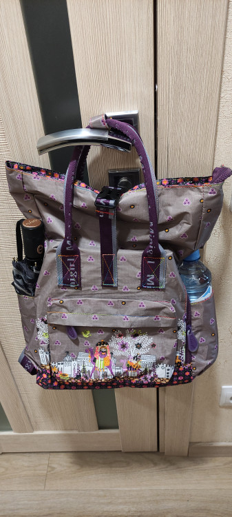 Достаточно вместительный, имеет отдельные карманы для воды и зонта, карман, прилегающий к спине для ключей. Удобные ручки, можно нести, как сумку