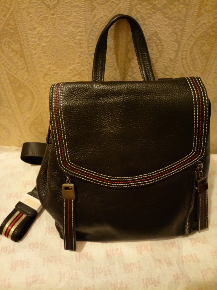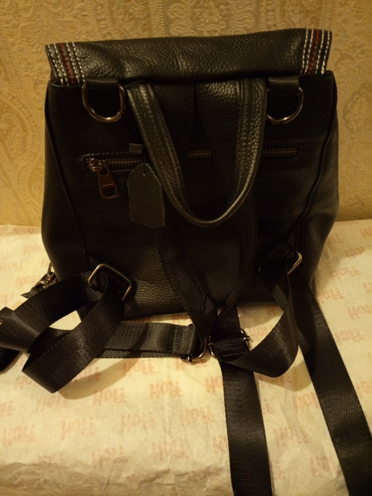 Рюкзак кожаный, мягкий, приятный на ощупь. Много карманов, внутри есть два отделения на молнии. Регулируется ширина. Есть отдельная ручка, чтобы носить сумкой. Смотрится очень симпатично.