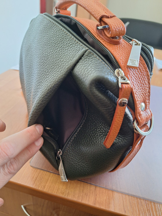 Сумка добротная и практичная. Кожа мягкая и приятная на ощупь. Очень красивое сочетание цветов: темно-зеленый (хаки) и бежевый. Довольно вместительная несмотря на небольшой размер.