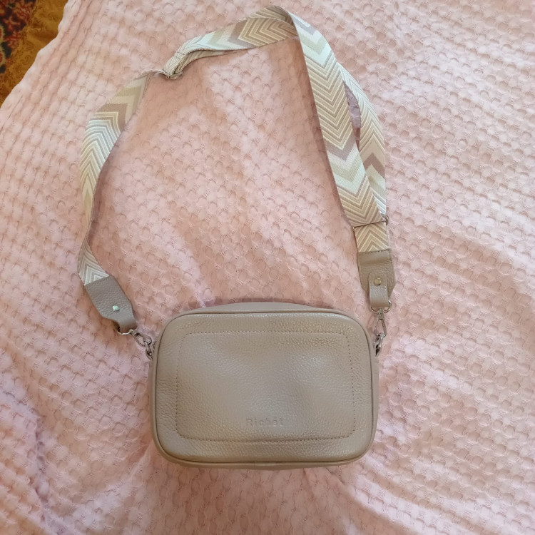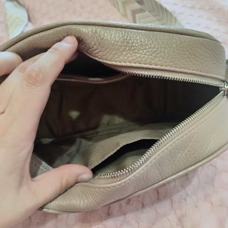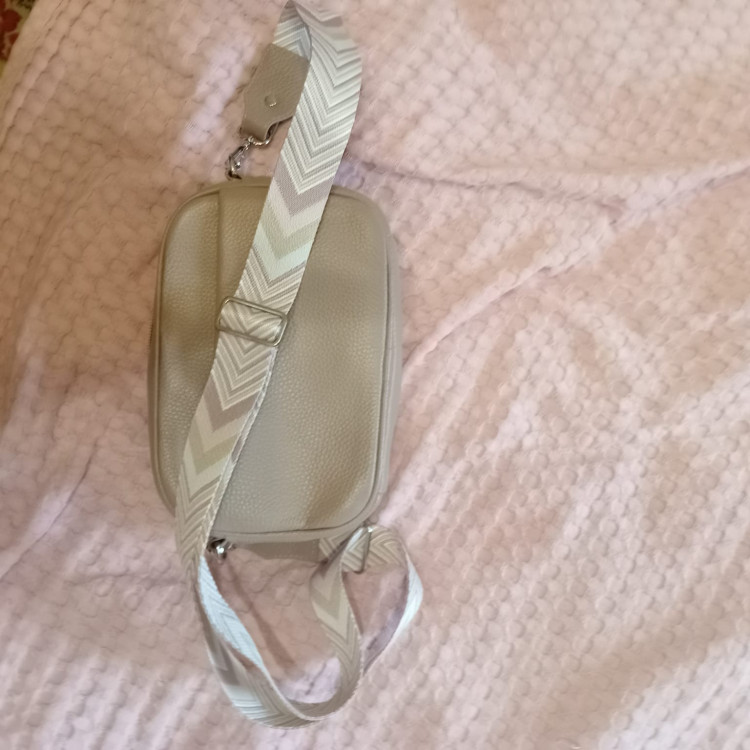 Сумка нейтрального, бежевого цвета сочетается с любым цветом в одежде. Удачно подходящий размер и комфортные карманы по бокам на молнии; текстильный, регулируемый ремень. Практичная сумка на каждый день. Покупкой довольна!!!