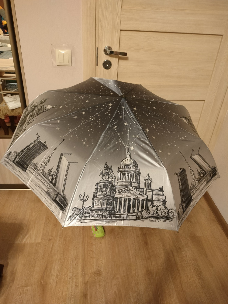 Чудесный зонтик с видами любимого города Санкт-Петербурга). Зонт красивый, сделан качественно, упаковка отличная! Обещали привезти после Новогодних праздников, в итоге доставили в пункт выдачи через пару дней, было неожиданно, но очень приятно)
