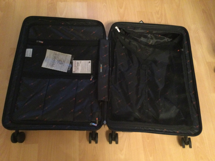 - Внутренности чемодана состоят из 2х просторных отделений с тканевой перегородкой и внутренними ремнями для фиксации багажа, дополнительный сетчатый разделитель.