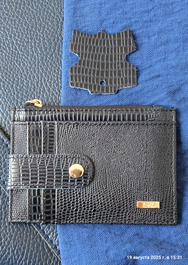 Темно-синий цвет ближе к чёрному, что порадовало, т.к. подходит к любой сумке. Запах легкий, пахнет натуральной кожей. Сшито ровно и аккуратно. Достаточно тонкая, чтобы просто положить в карман и выйти на перерыв или в магазин или положить в маленькую сумочку.