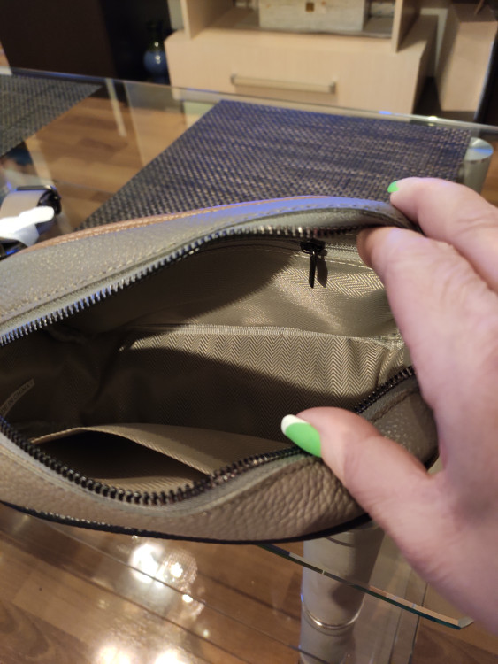 Имеет одно отделение с внутренними карманами для документов и мелочей. Застёгивается на молнию.