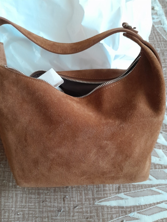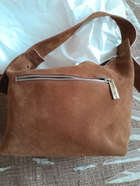 Сумка качественная с удобной ручкой, дополнительно есть длинный ремешок из замши того же цвета. Хотелось бы отметить, что на фото чуть рыжее цвет)