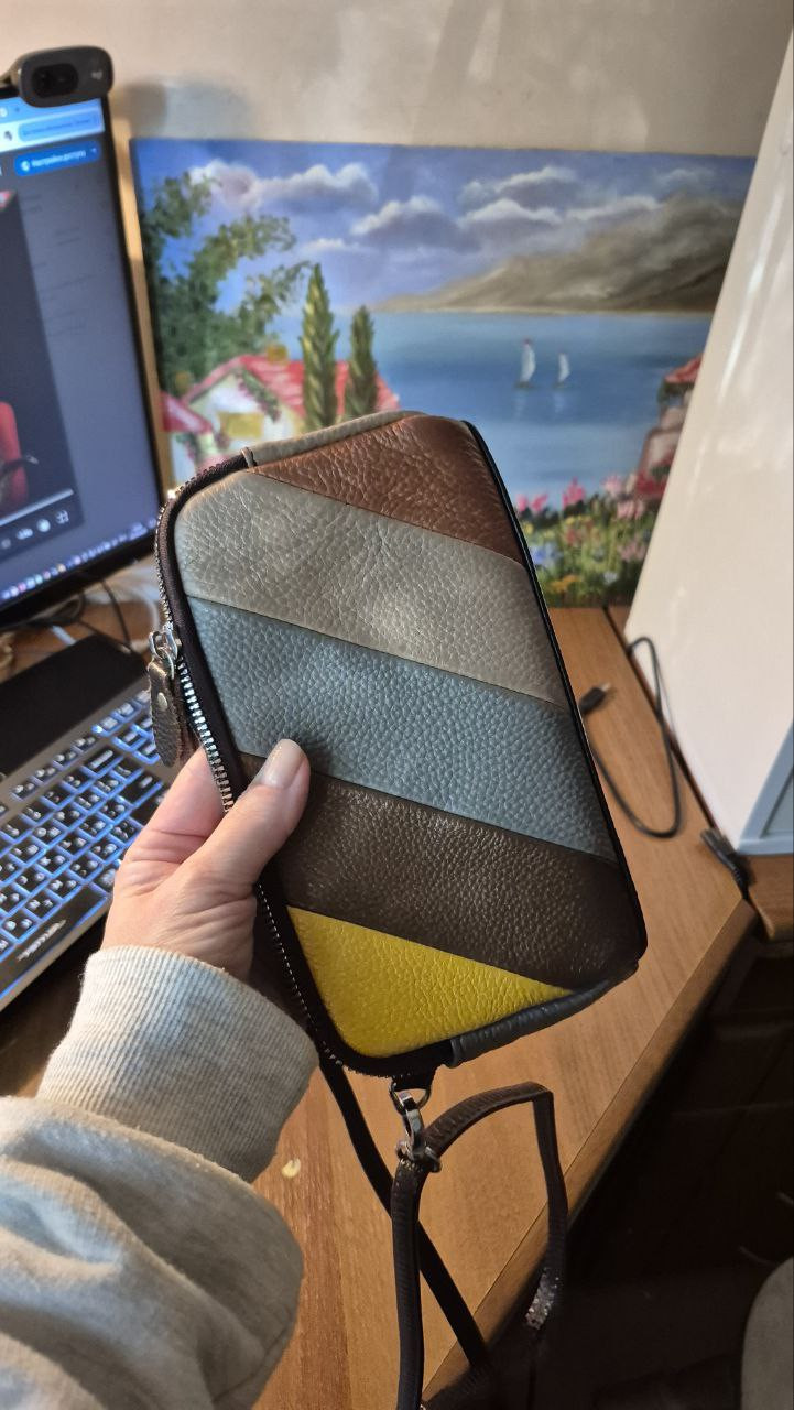 Прекрасна на подарок! Купила уже второй подруге, нравится, что можно надевать со всеми вещами, т.к. разнообразие цветов. Кожа чувствуется - на ощупь, на запах. Смартфон спокойно помещается, два отсека внутри, плюс еще 2 маленькх кармашка - один на замочке, другой открытый - для мелочей, карт и др.