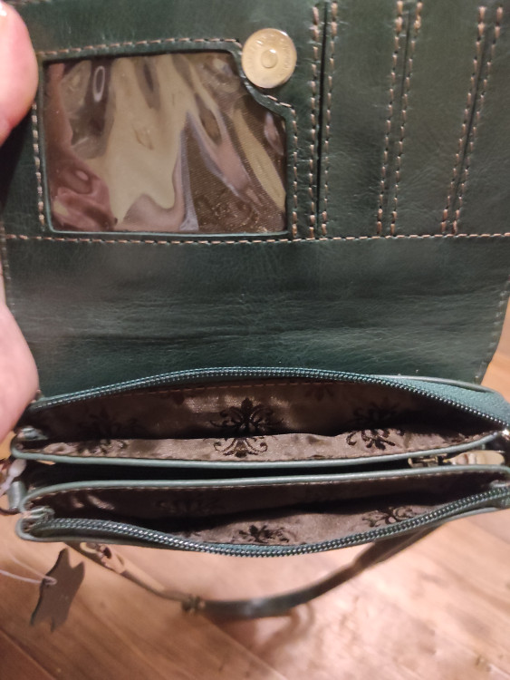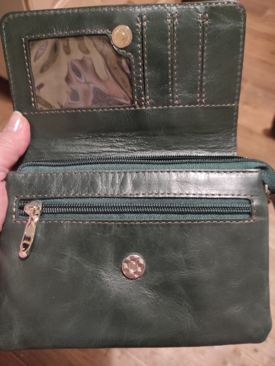 Сумочка из кожи может быть также кошельком и косметичкой, так как свободно поместится в любую дамскую сумку, нужно лишь снять ручку, которая легко отстегнется с помощью карабинов.